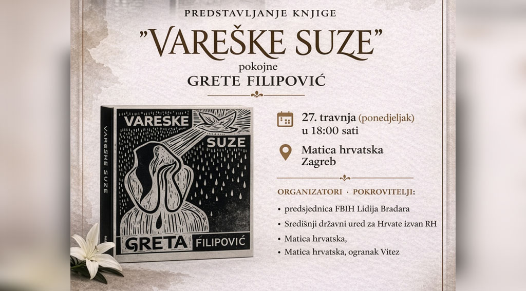 „Predstavljanje knjige 'Vareške suze' bit će prigoda za dostojanstveno prisjećanje na život i hrabrost pokojne Grete Filipović, ali i za razgovor o važnosti istine, pamćenja i javnog svjedočenja o stradanjima hrvatskog naroda u Bosni i Hercegovini“, ističu organizatori. (kta)