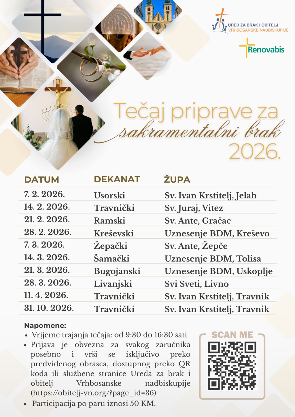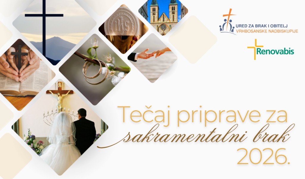 Ured za brak i obitelj, u suradnji s Centrom za savjetovanje Vrhbosanske nadbiskupije, organizira i u 2026. godini ciklus tečajeva priprave za sakramentalni brak po raznim dekanatima Vrhbosanske nadbiskupije. Kroz cjelodnevni program zaručnici će proći kroz četiri velike tematske cjeline: teološko-duhovnu, psihološko-pedagošku, medicinsku i crkveno-pravnu, izvijestili su iz spomenutog Ureda.